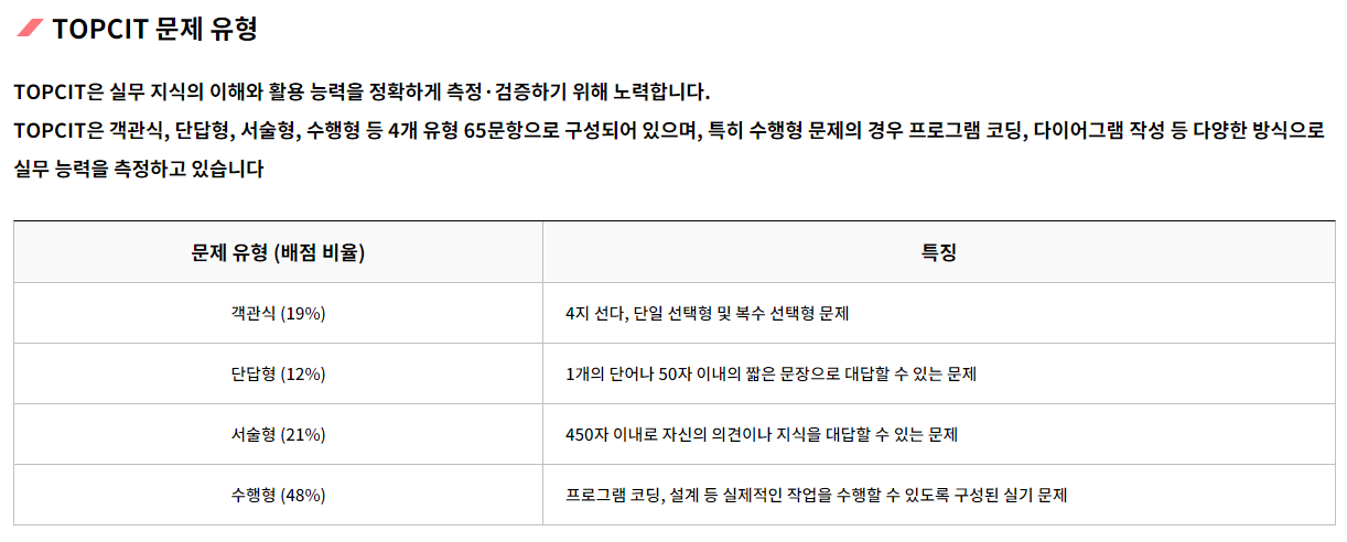 또한 문제 유형은 총 네가지로, 객관식과 단답형, 그리고 서술형과 수행형이 있습니다. 특히 수행형의 경우, 실제로 프로그램 코딩 및 설계 등을 수행해야 하는 실기 문제입니다.