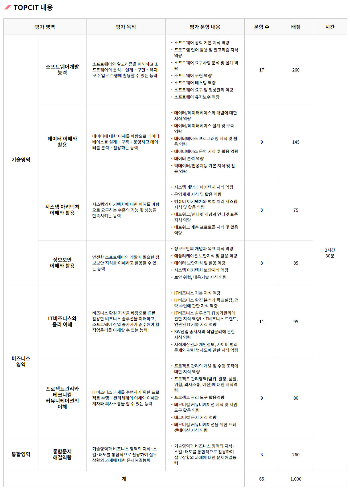 마지막으로는 구체적인 TOPCIT 시험 내용에 대해서 알아보도록 하겠습니다. TOPCIT은 총 2시간 30분동안 치뤄지며 만점은 바로 1, 000점입니다. 실무와 관련된 과목들이 큰 비중을 차지하고 있다는 게 보이시죠?