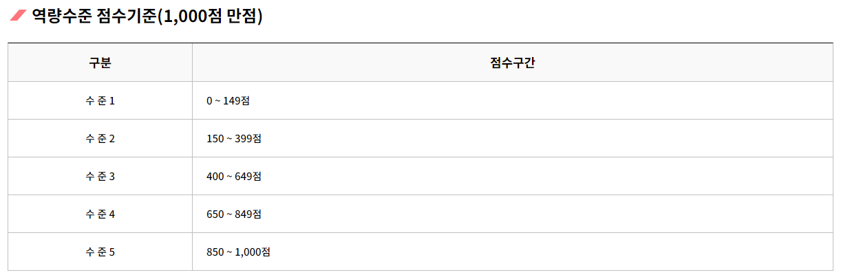 만점 1,000점을 기준으로 점수대에 따라 역량수준 또한 나누어지고 있는데요. 아래 표에 나타난 점수구간에 따라서 역량수준이 나누어지고 있으니 반드시 확인해보시기를 바라겠습니다.